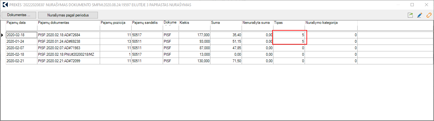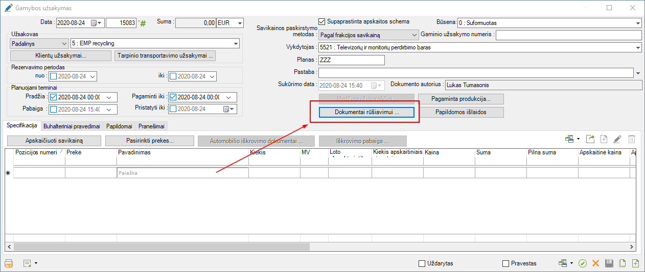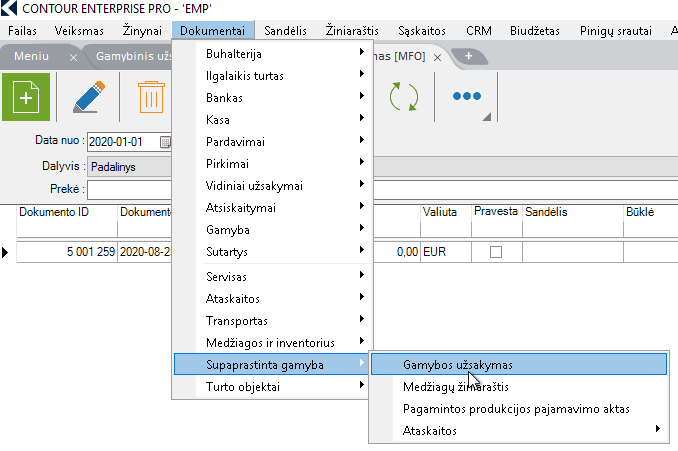Supaprastintos gamybos randamos programos meniu Dokumentai -> Supaprastinta gamyba: