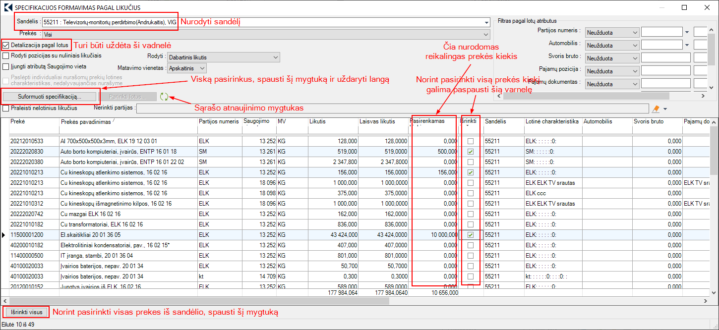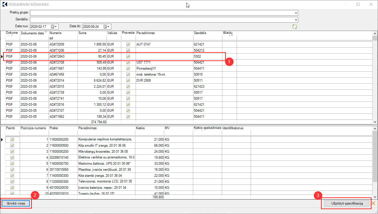Viršutinėje dalyje pasirinkti dokumentą, apatinėje – paspausti mygtuką Išrinkti visas ir tada Užpildyti specifikaciją: