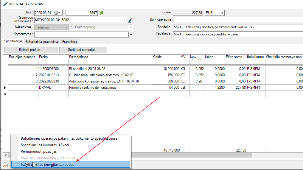 Norint įvesti elektros sąnaudas, į medžiagų žiniaraštį reikia įterpti elektros sąnaudų eilutes. Tam yra sukurta speciali funkcija: