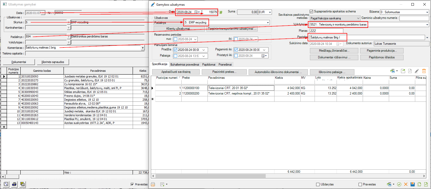 Gamybą į programą galima įvesti dviem būdais – rankiniu būdu (taip, kaip trečiame kontūre) arba pagal dokumentą (pvz. pajamavimą arba važtaraštį).
