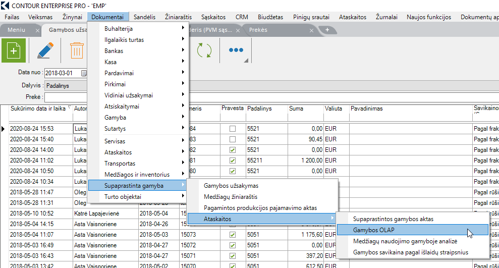 Pagamintos produkcijos OLAP vadinasi Gamybos OLAP. Norint atsifiltruoti gamybas pagal padalinį, naudoti filtrus padalinio arba sandėlio pjūviuose, pvz. taip: