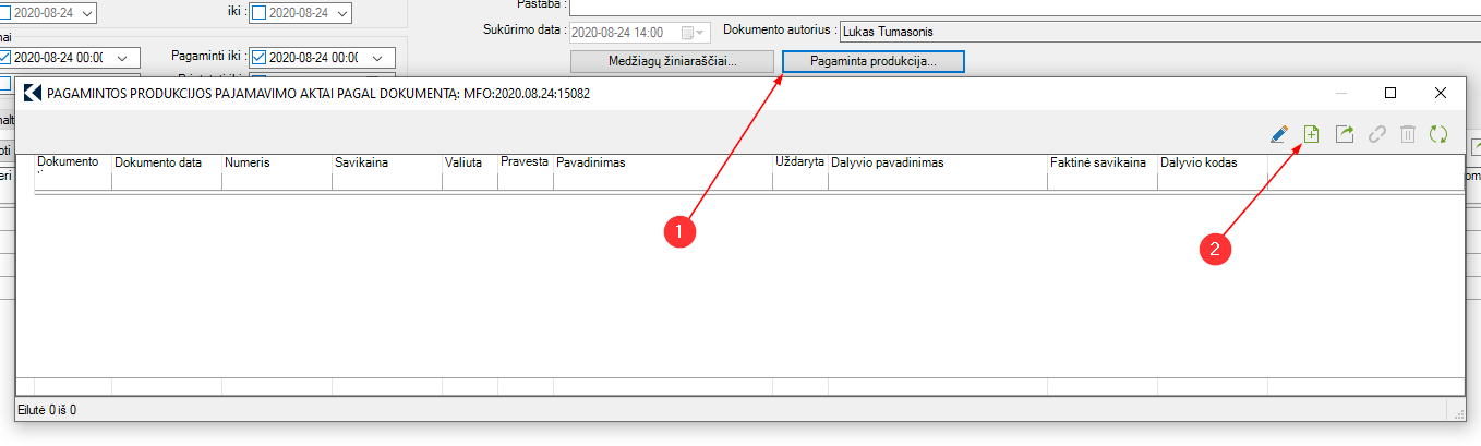Norint sukurti pagamintos produkcijos pajamavimo aktą, reikia spausti mygtuką Pagaminta produkcija ir sukurti naują įrašą: