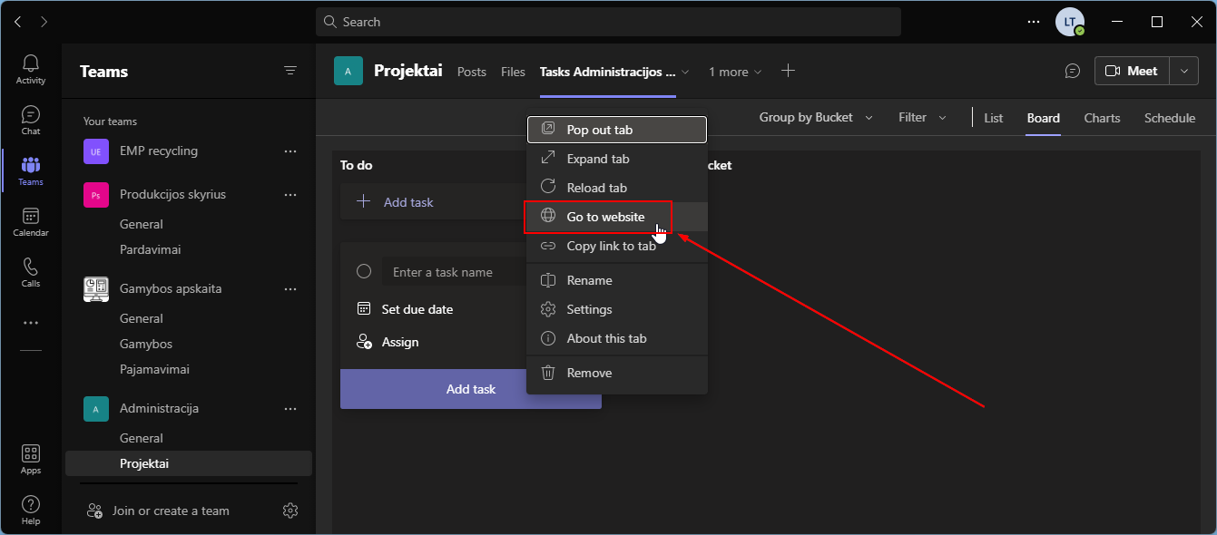 - Su dauguma Teams funkcijų nebūtina dirbti per Teams programą. Tam galima naudoti naršyklę arba taikomąsias programas. Keltas pavyzdžių: