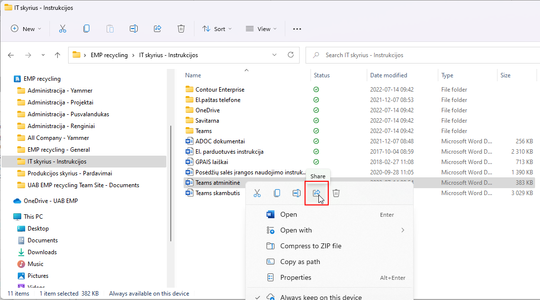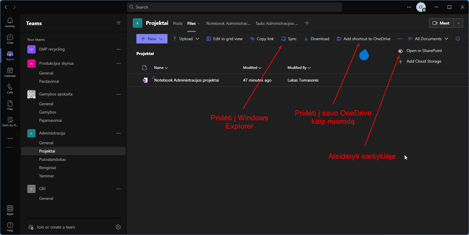 - Komandos dokumentais galima dalintis taip pat, kaip ir iš OneDrive. Pvz. vyksta projektas ir projekto nariams reikia susirinkti informaciją iš projekte nedalyvaujančių žmonių.