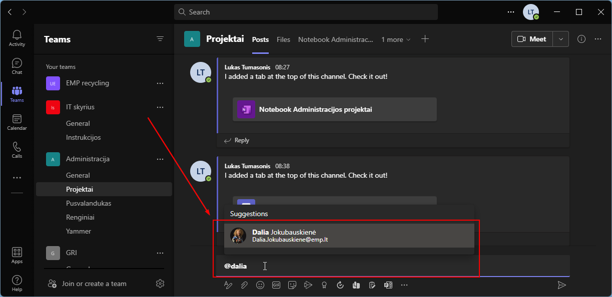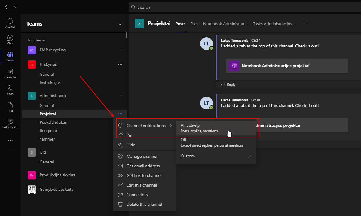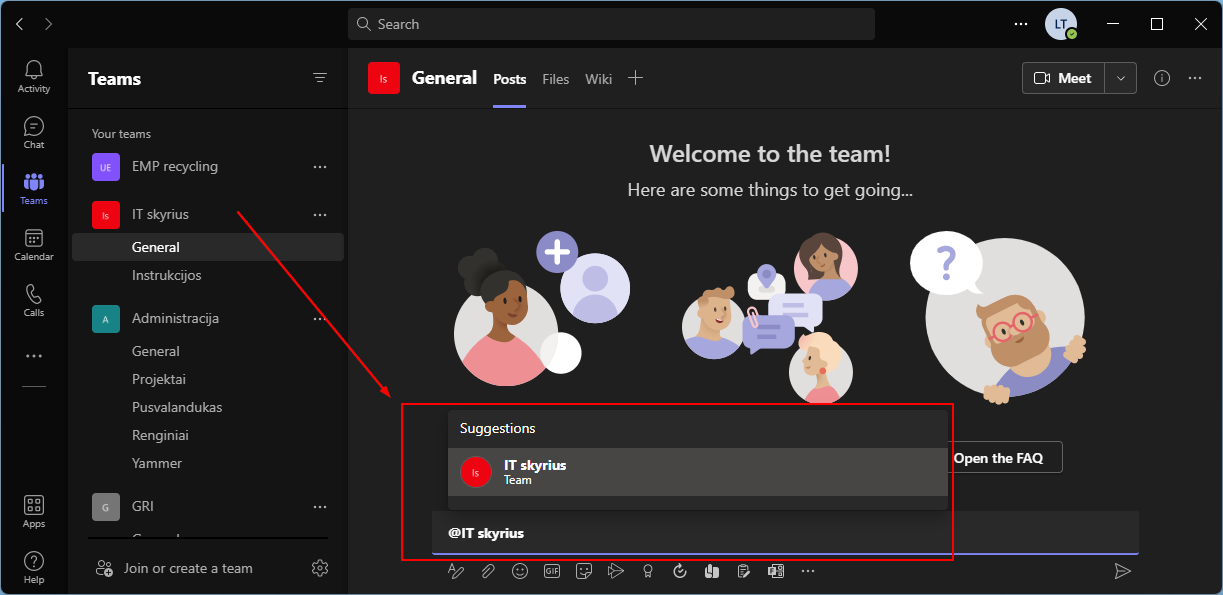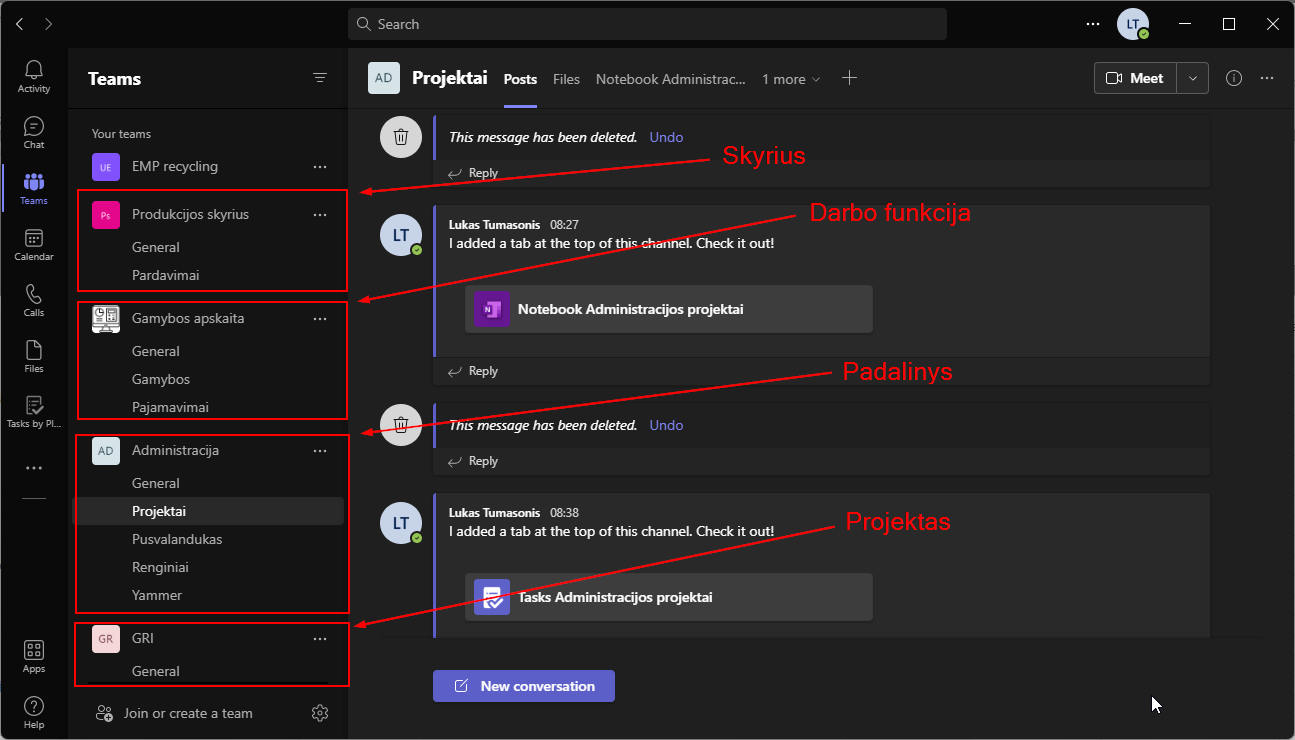 - IT skyrius teamsų nevaldo ir turinio niekaip neprižiūri. IT skyrius teikia tik konsultacijas, o šiuos veiksmus gali atlikti tik kritiniais atvejais.
