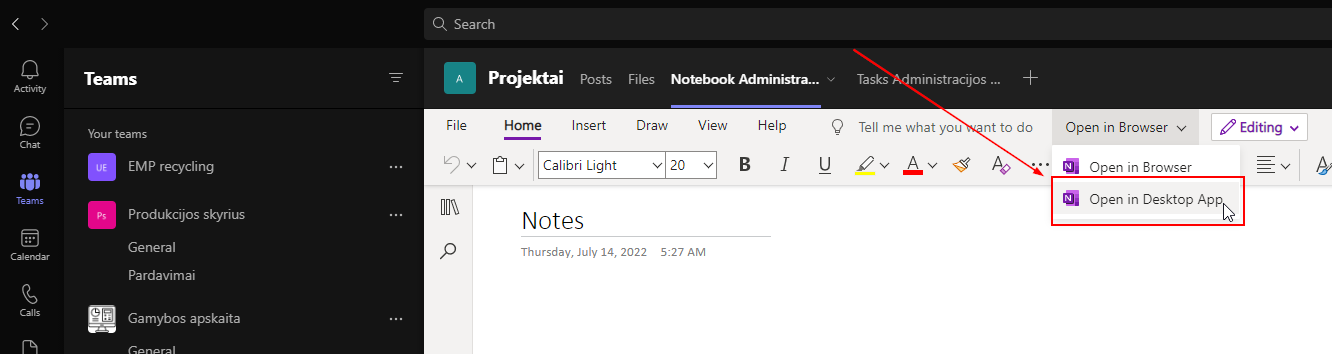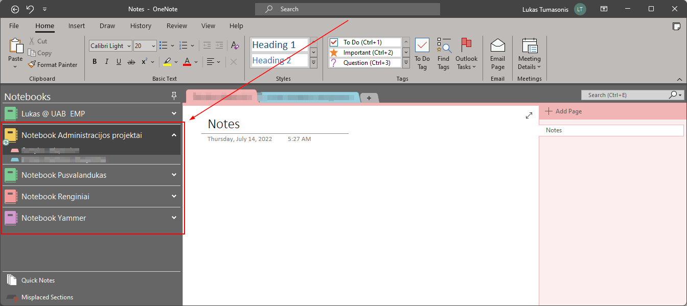 OneNote Notebooką galima atsidaryti ir visada turėti OneNote programoje: